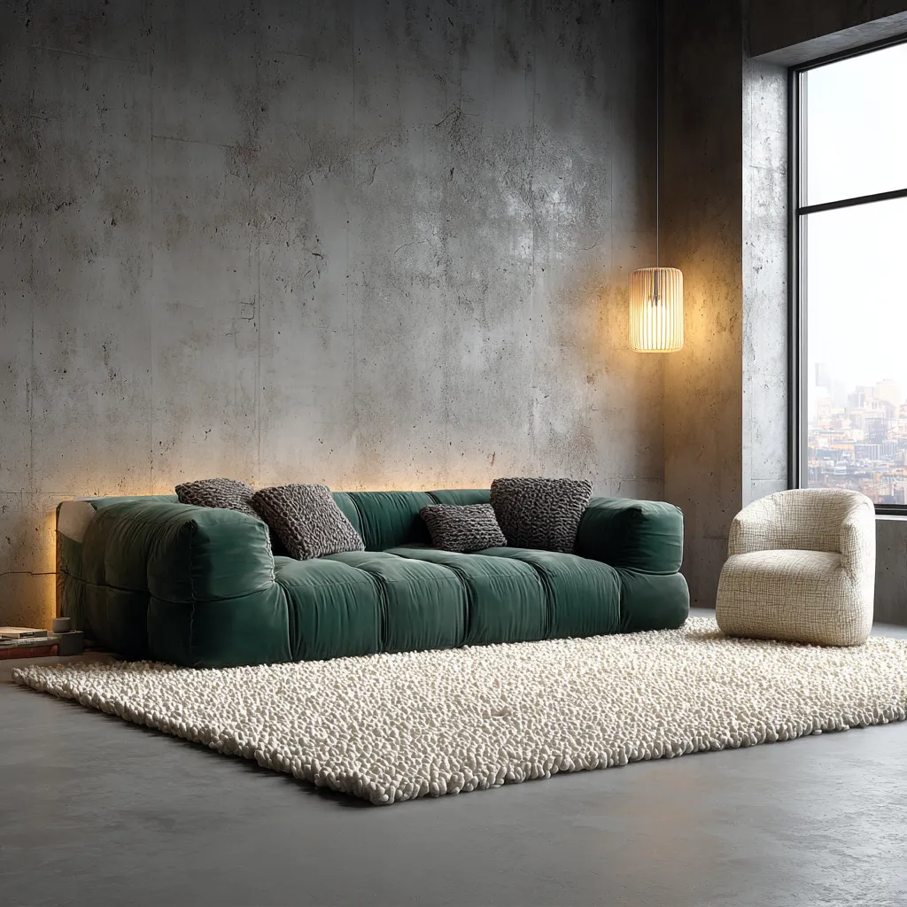 Lofts often feature prominent concrete elements, which can sometimes feel cold. The secret to a welcoming space is balancing these hard surfaces with soft, luxurious furnishings.
