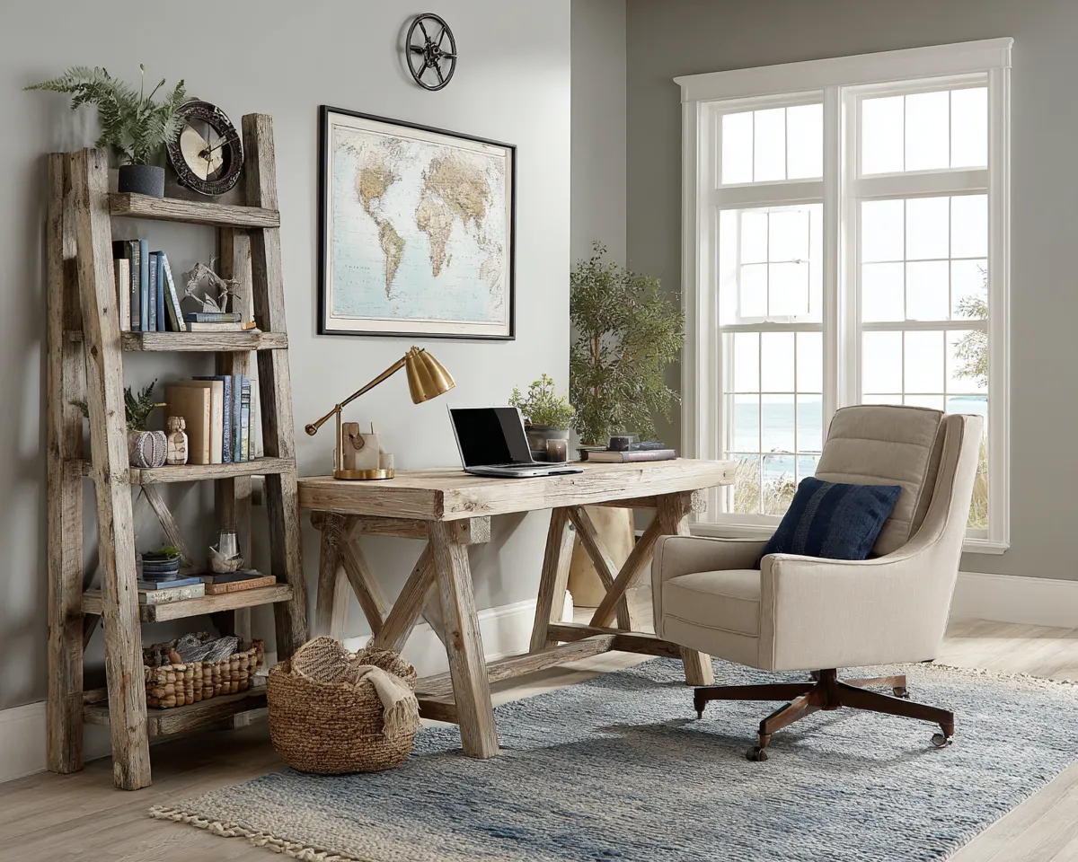Make your home office a place of calm focus and seaside inspiration. ⚓ Utilize a palette of blues, greens, and natural wood tones. Incorporate elements that evoke the sea: a desk with a weathered wood finish, shelving with rope accents, or even a subtly framed maritime map.