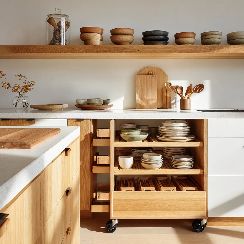 * **Vertical Space:** Install open shelving for frequently used, beautiful pieces (like ceramic mugs or wooden bowls).