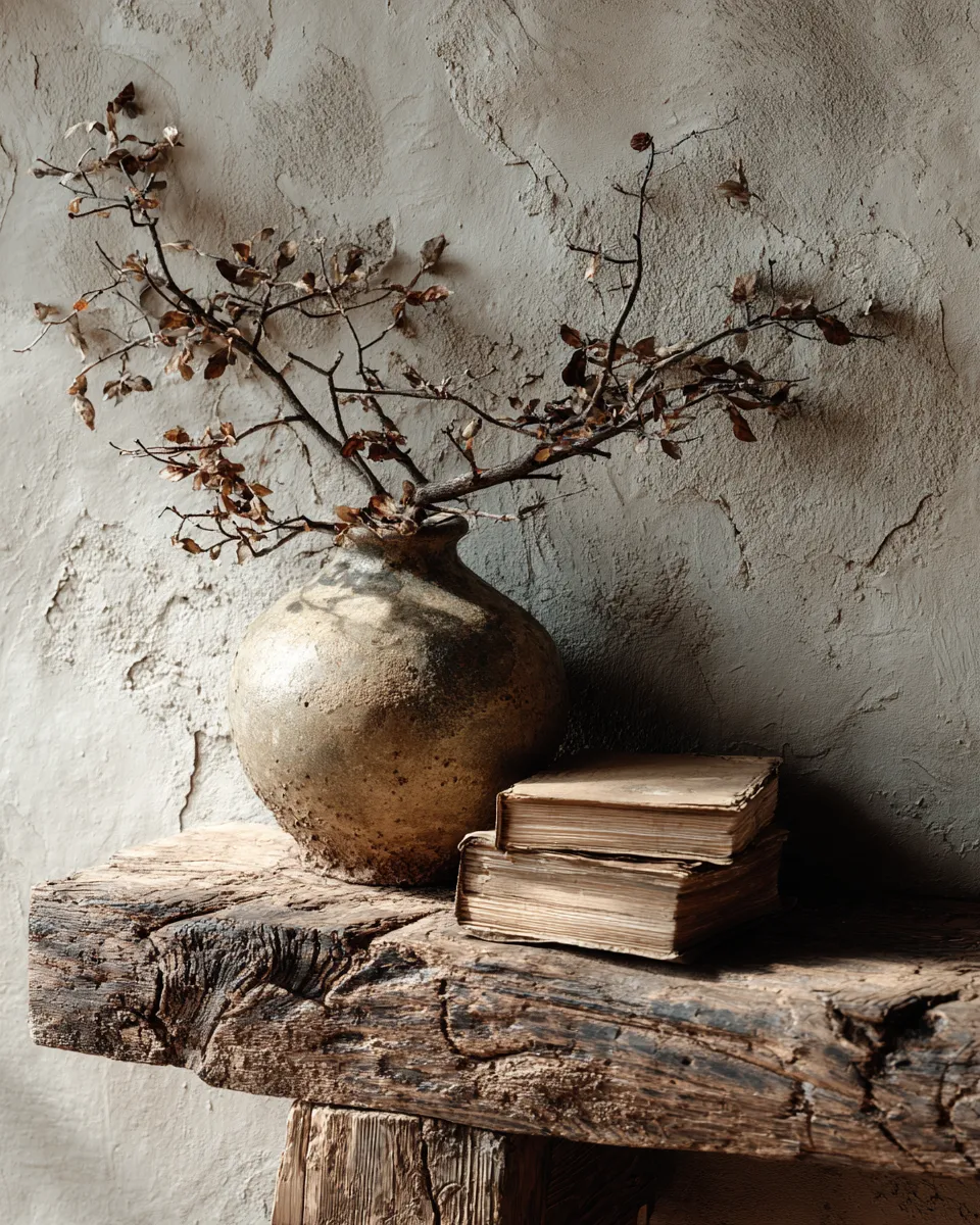 * **Natural Materials:** Think rough-hewn wood, weathered stone, handmade ceramics.