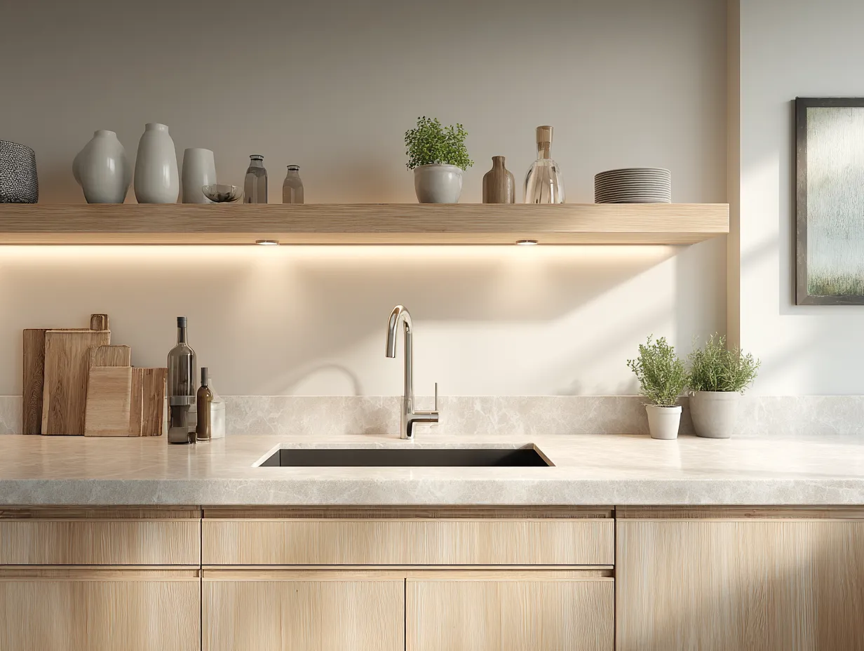 • **Wood Cabinetry:** Opt for light-toned woods like oak or maple.