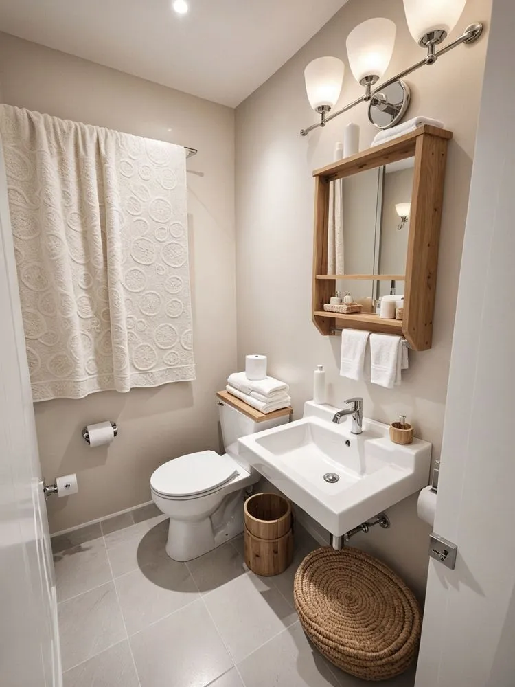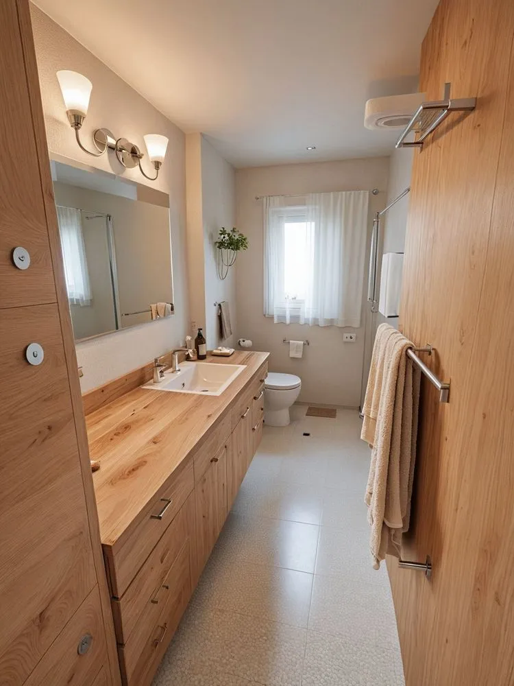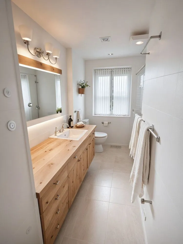 a large bathroom is shown with white tile flooring and wooden cabinets