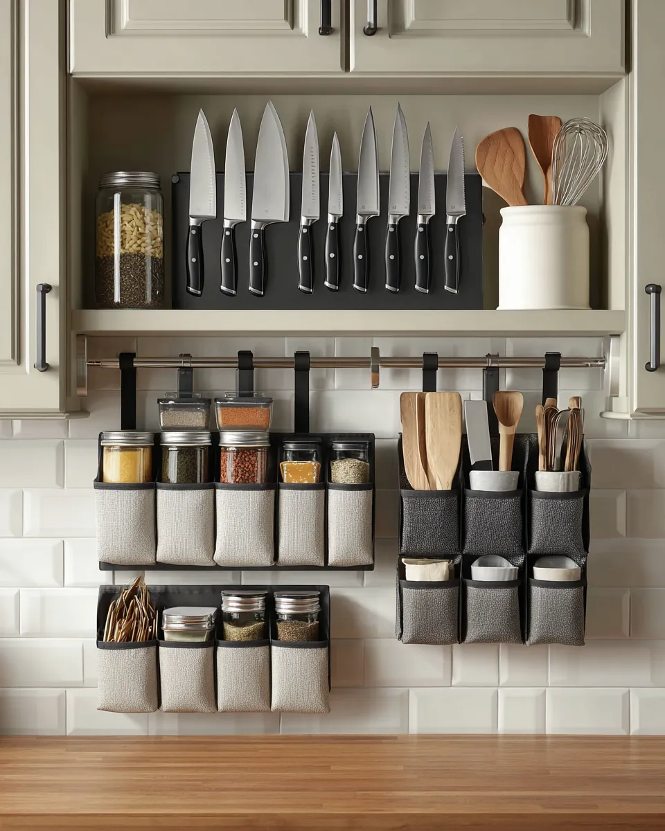 Unlock your tiny kitchen's storage potential! ✨ Think beyond cabinets. Utilize the space above your fridge with a custom-fit shelf. Install a magnetic strip on the backsplash for knives and utensils. Over-the-door organizers for pantries or cabinet doors can hold spices or cleaning supplies. Use tension rods for creating extra shelves in narrow spaces. Drawer organizers are a must for cutlery and small gadgets. Vertical pegboards can store pots, pans, and even small appliances! 🍳