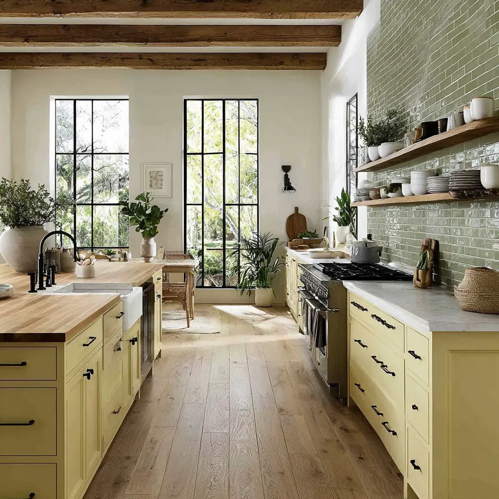 Brighten your home with the joyful combination of sunshine yellow and calming sage green! ☀️ This pairing is perfect for creating an airy, cheerful farmhouse kitchen. Imagine soft yellow cabinetry paired with sage green subway tiles, or a statement yellow island. Add natural wood elements and touches of matte black hardware for a modern farmhouse feel. 🌿 This palette brings a sense of warmth and natural beauty. Save this for a kitchen that feels like a breath of fresh air! #FarmhouseKitchenIdeas#YellowKitchenDecor#SageGreenKitchen#KitchenInspo#CountryStyle#HomeRenovation#ColourfulKitchen#AiryDesign#KitchenGoals#DreamKitchen