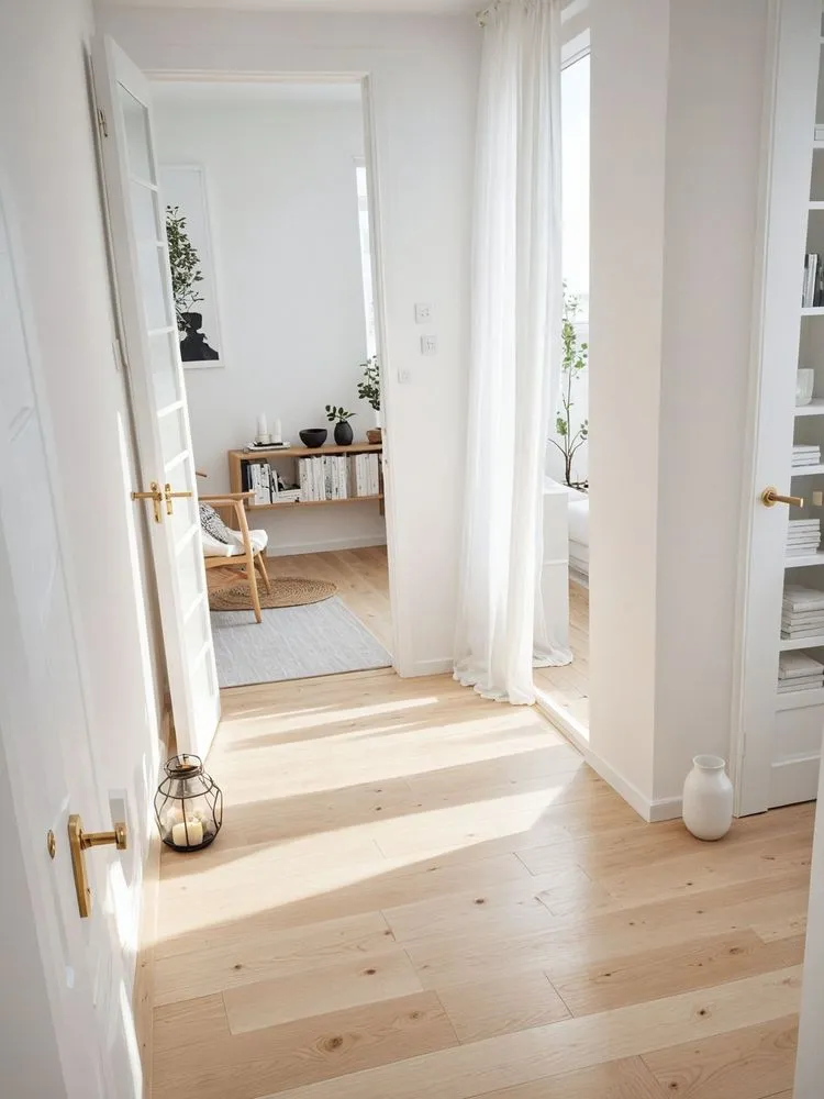 view of hallway in a white and wood home