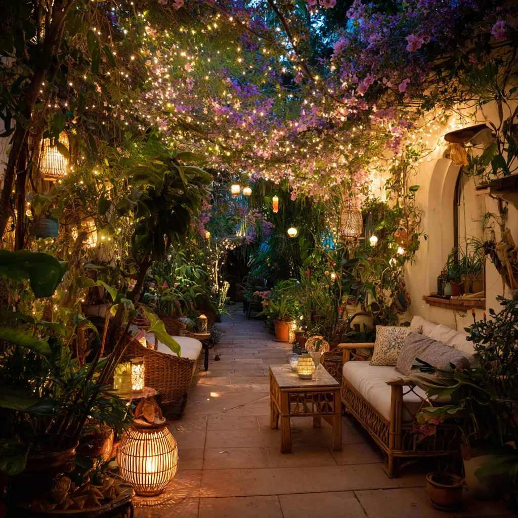 Fairy lights are a must – draped along fences, pergolas, or intertwined with greenery. Edison bulb string lights offer a warm, industrial-boho feel. Lanterns are perfect for a cozy glow – think Moroccan lanterns, woven bamboo lanterns, or simple glass jars with candles. Consider solar-powered stake lights for pathway illumination. Dimly lit floor lamps can also add targeted warmth. 🌿