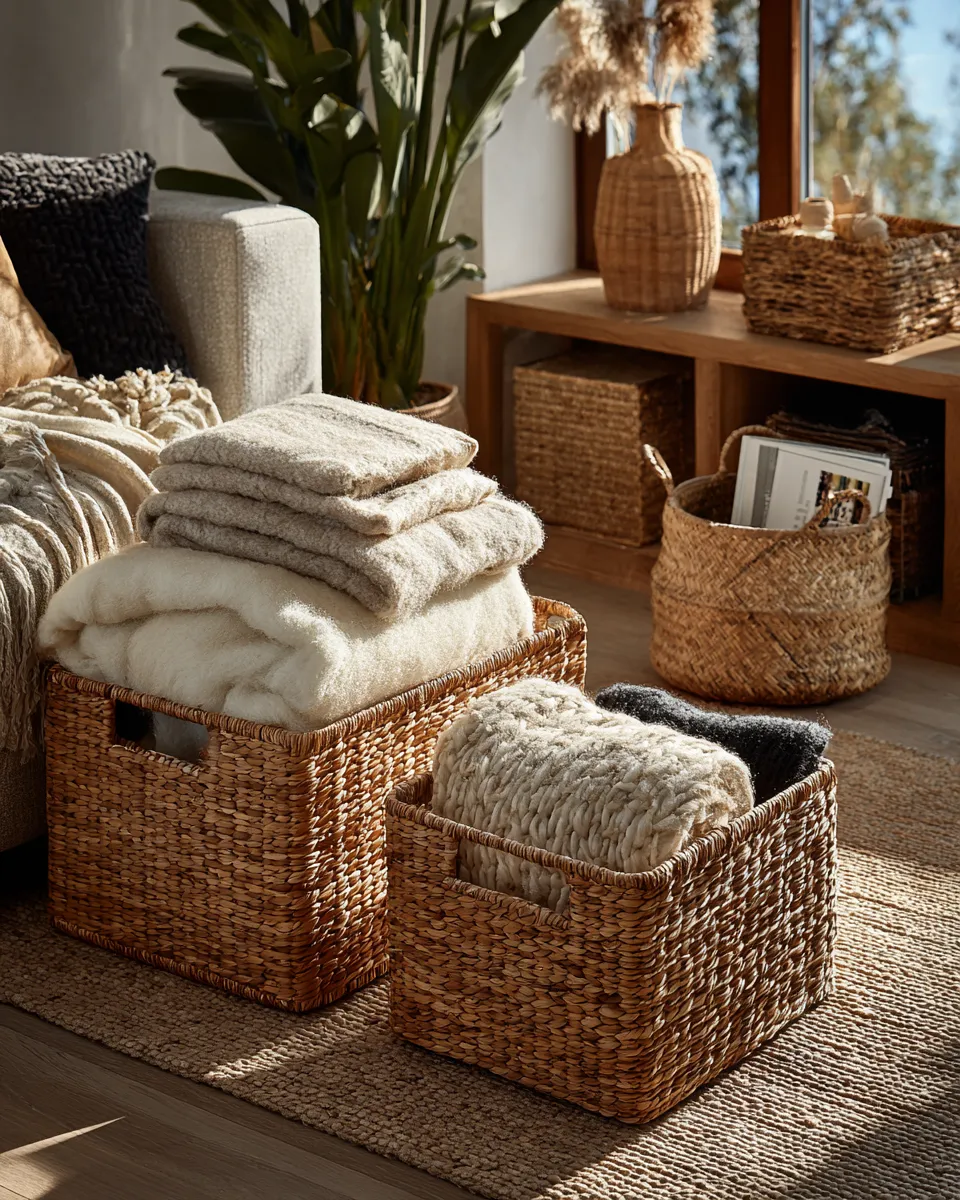 Baskets are more than just storage; they're woven works of art! From seagrass and water hyacinth to jute and rattan, these natural fiber beauties add instant texture and warmth to any room. Use them to corral blankets in the living room, store toiletries in the bathroom, or organize entryway essentials. They bring an organic, handmade touch that's both functional and stylish. Don't underestimate their power to declutter and decorate! Save this for chic, natural storage solutions! ✨ #BasketDecorIdeas#StorageSolutionsIdeas#WovenStorageIdeas#NaturalBasketIdeas#HomeOrganizationIdeas#HomeDecor#InteriorStyling#JuteBaskets#RattanBaskets#BohoDecor