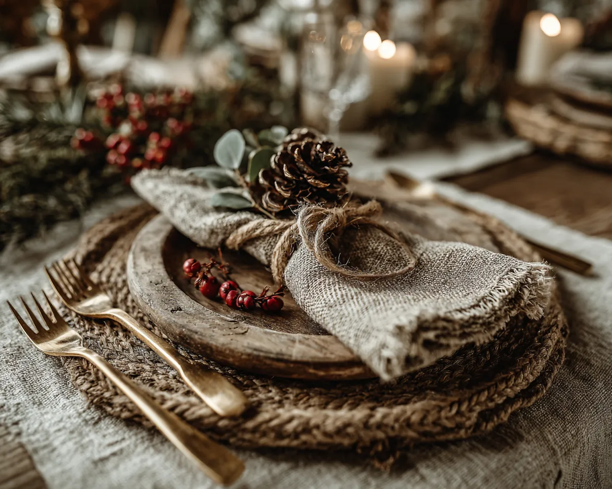 This holiday season, let's bring the outdoors in for a truly grounding Christmas tablescape. 🌲 Focus on natural materials like unfinished wood chargers, linen napkins tied with twine, and fresh greenery like eucalyptus and pine sprigs. 🌿 To add a touch of festive elegance, incorporate subtle gold accents – perhaps in cutlery or small decorative elements. Avoid clutter and opt for simple, organic centerpieces like a trio of pinecone-filled bowls or a wooden log adorned with berries. The goal is a luxurious yet unfussy feel that celebrates the beauty of nature. It's the perfect setting for intimate gatherings. Save this for your holiday dining inspiration! 🕯️ #RusticChristmasIdeas#NaturalTablescapeIdeas#ChristmasTableSettingIdeas#HolidayDiningIdeas#EarthyEleganceHolidays#TableDecor#HolidayDecorating#GreeneryDecor#GoldAccents#EntertainingIdeas