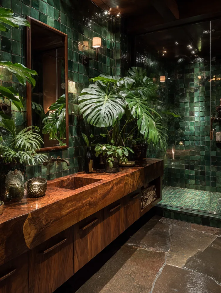 Tropical Jungle Oasis: Deep Greens & Rich Teak for a Lush Bathroom ๐ด