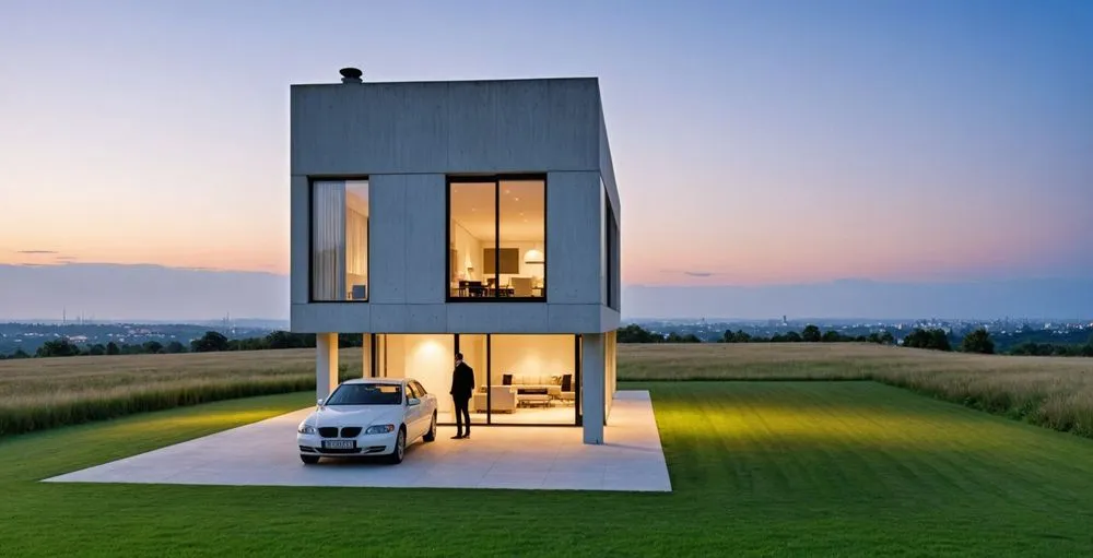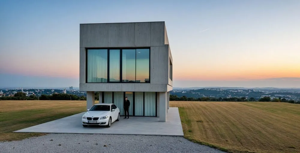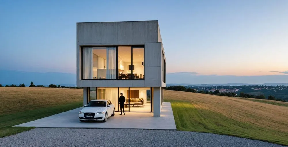 a white car in front of a modern home