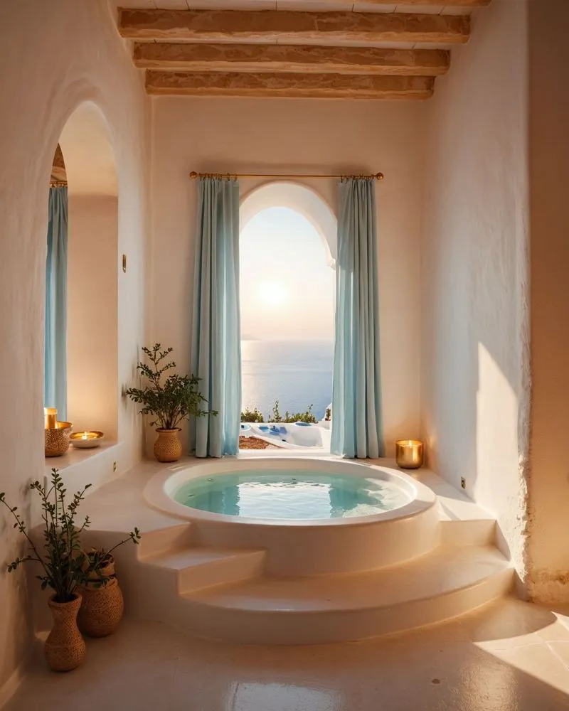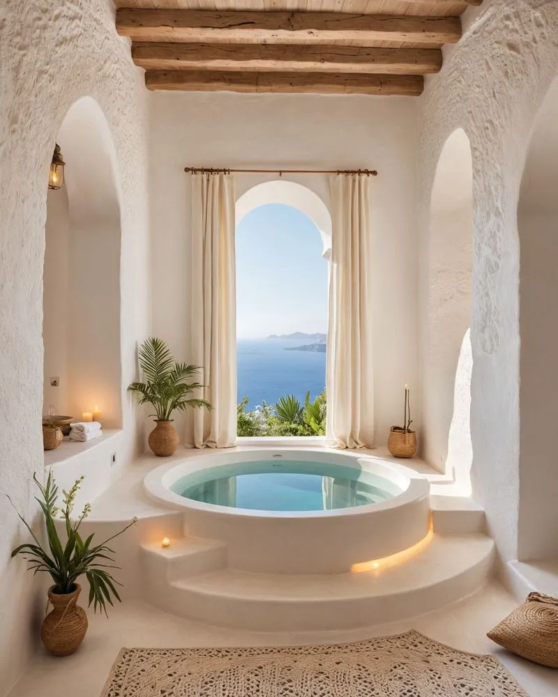 Small jacuzzi tub with white walls and a wooden ceiling