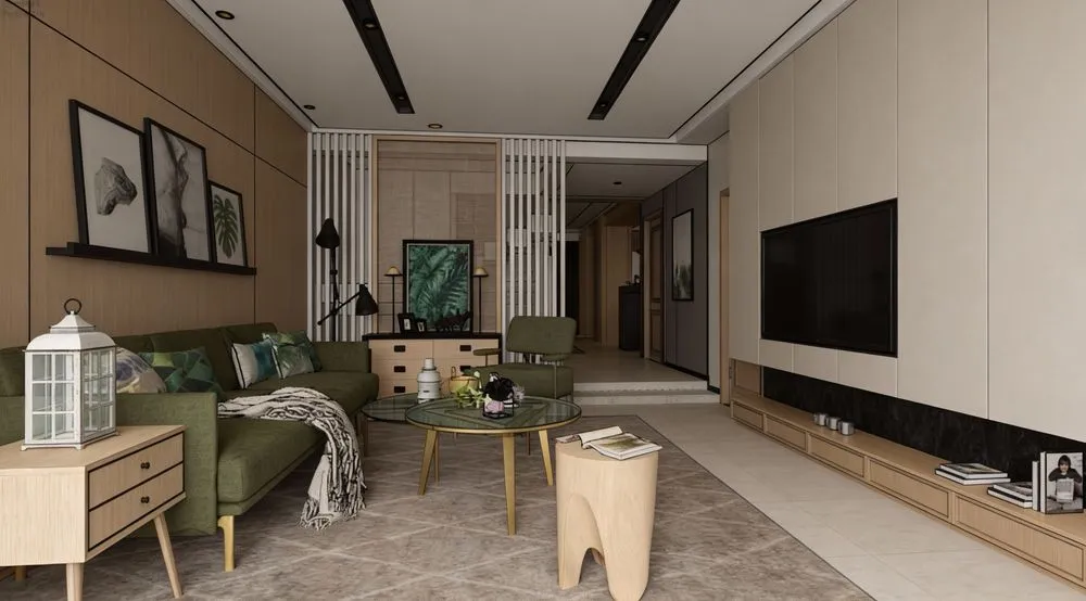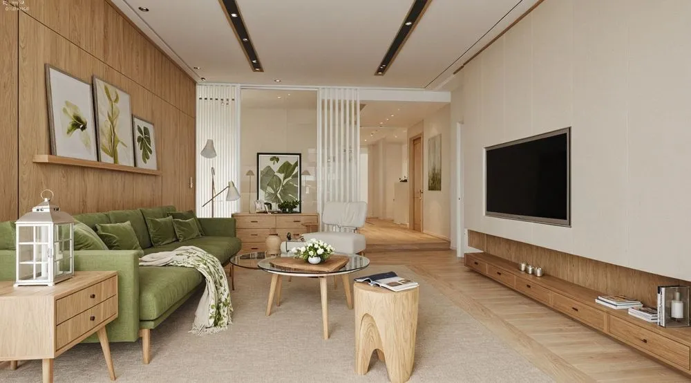 a modern wooden living room with a green sofa