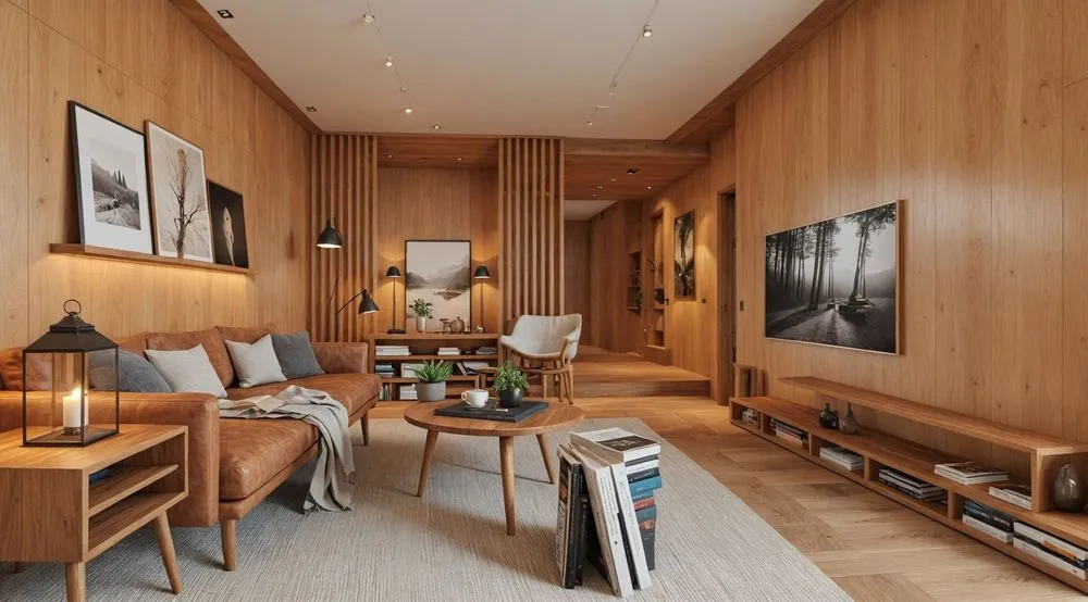 the large room is decorated with wood paneling and furniture