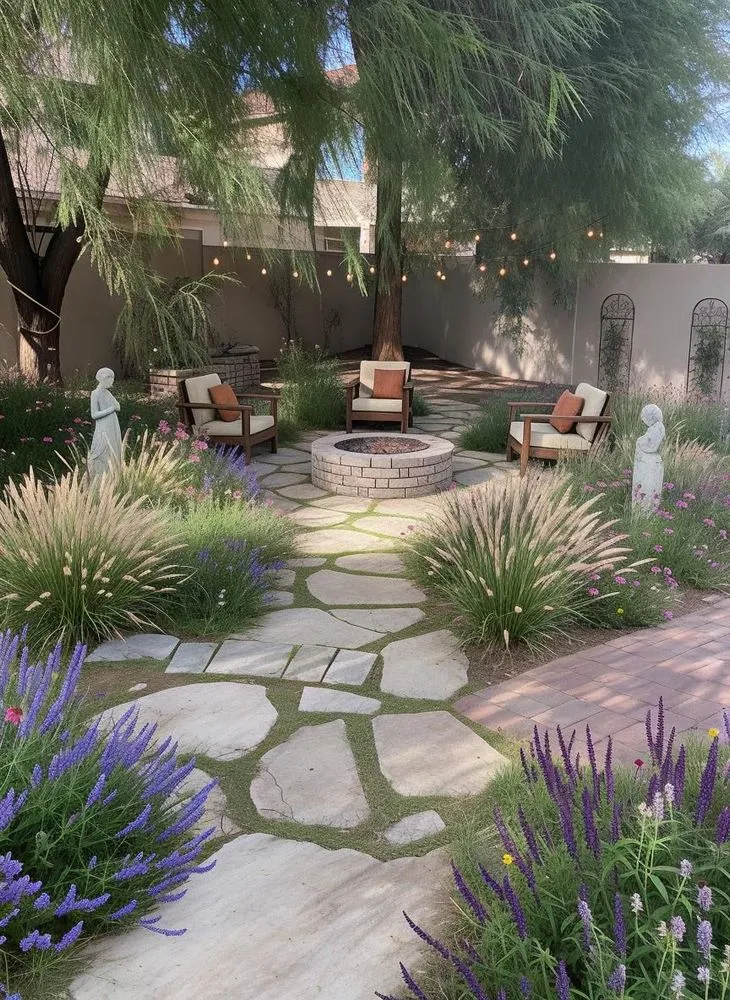 a small yard with patio seating, stone fire pit and grass