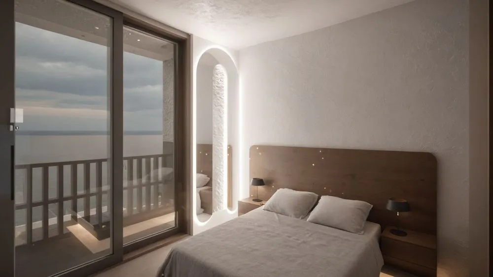 the bedroom has an ocean view with its doors open