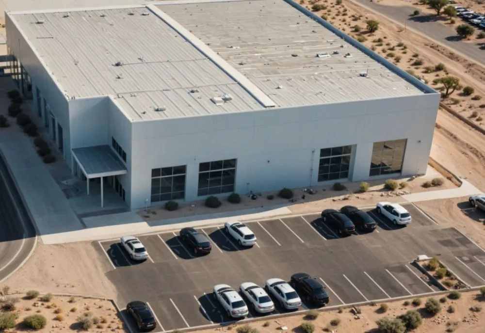 an aerial view of a store in the middle of a parking lot