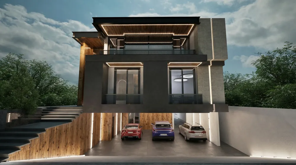 two cars are parked next to a house