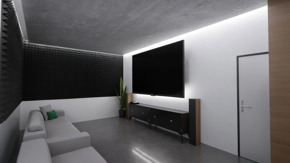 modern living room with large flat screen tv and long white couches