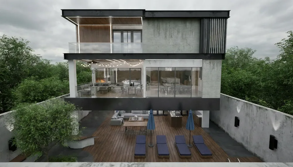 an open living room with large windows on both sides and furniture and lighting above