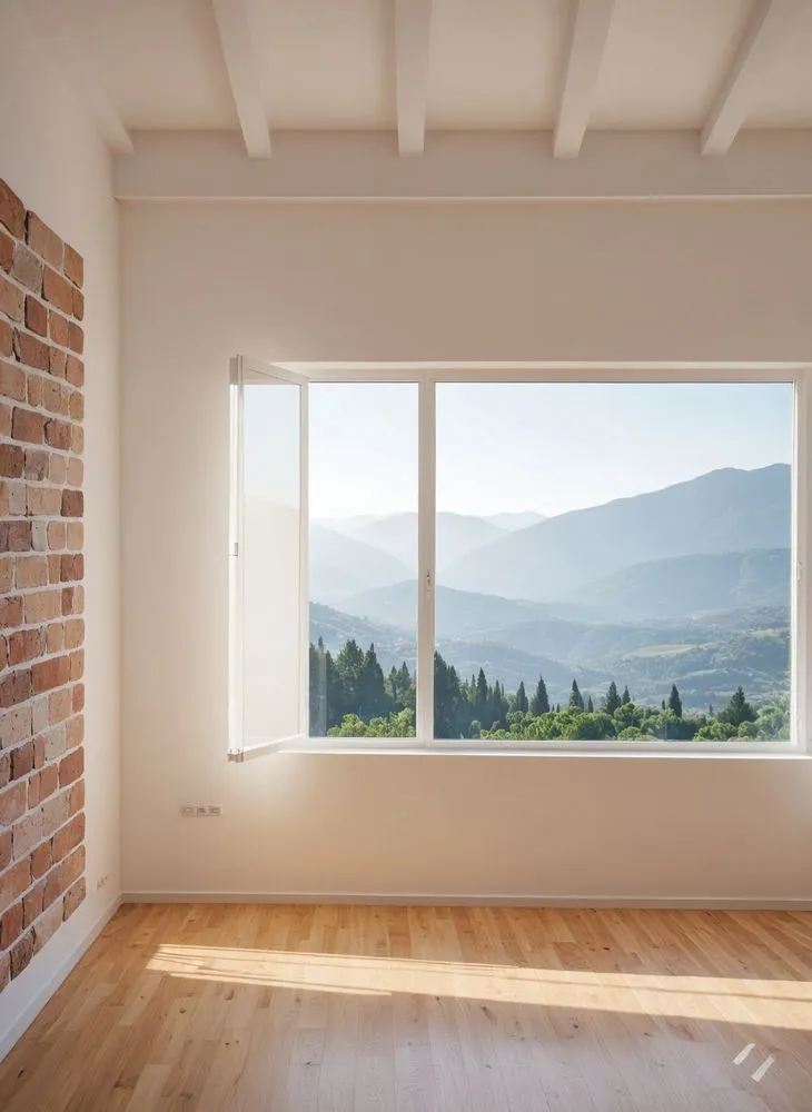 an empty room with a large window and mountains outside the window