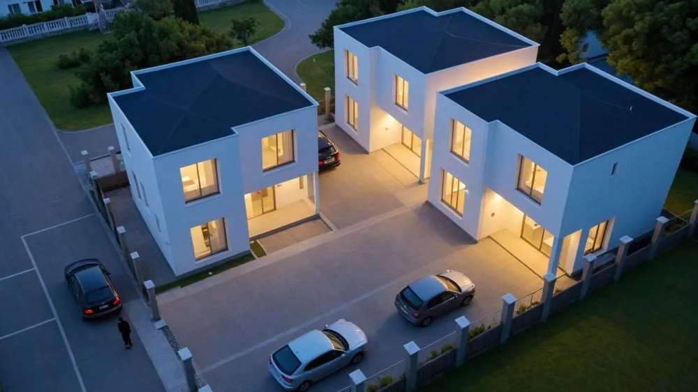 an aerial view of a two story house at dusk