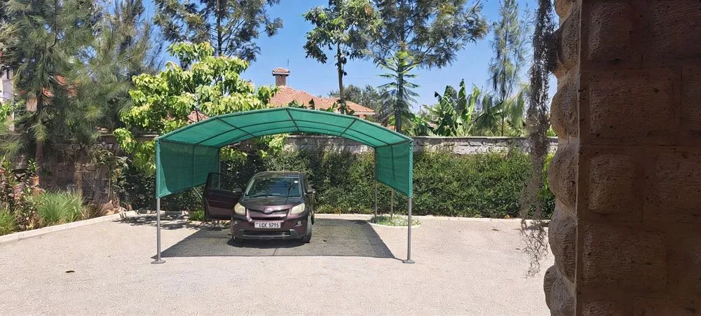 a car is parked under an arched canopy