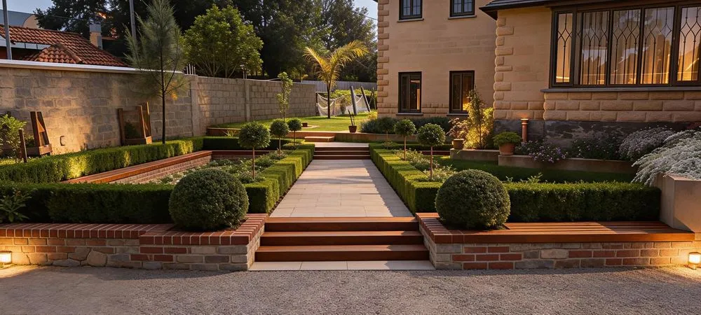 the front garden is lit up with lights and landscaping