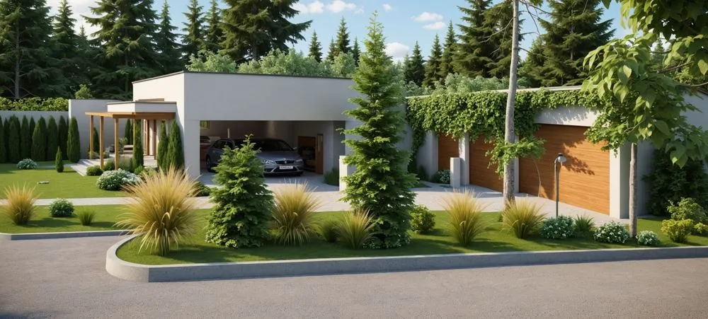 an artist's rendering of an open concept house with lots of green plants and a car parked in the garage