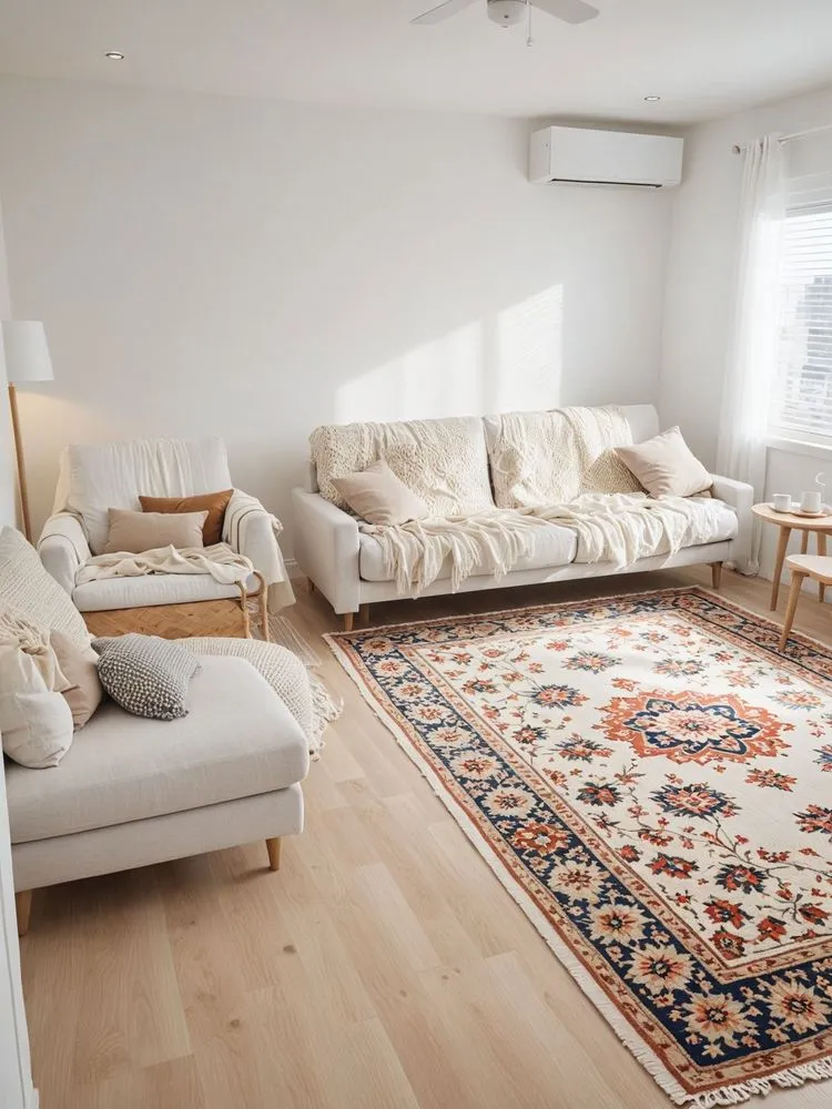 a large rug sits in a white living room
