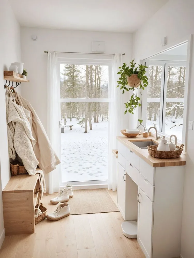 a very white kitchen with wood floor and white curtains