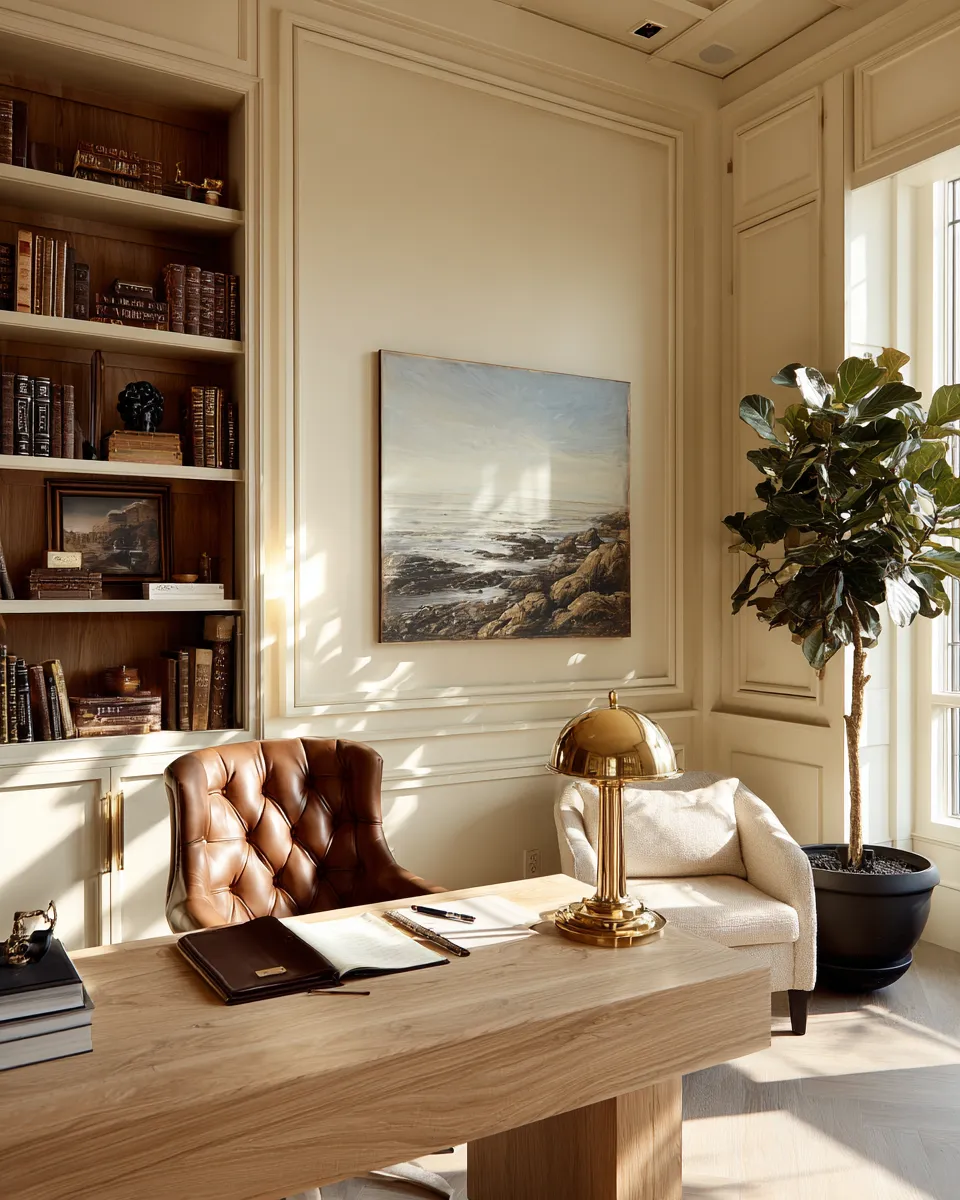 Create a home office that inspires productivity and tranquility, channeling the sophisticated charm of a country manor. 🌳 Think natural wood finishes – perhaps a large, solid desk in oak or walnut. Complement it with comfortable, classic seating and plenty of ambient lighting, like a desk lamp with an antique brass finish. Incorporate elements that bring the outdoors in, such as a potted plant or natural landscape art. Consider subtle, personal touches that make the space uniquely yours. This is your command center, designed for focus and elegance. Save this for your ultimate home office! ✨ #CountryManorOfficeIdeas#RusticOfficeIdeas#HomeOfficeIdeas#SophisticatedWorkspaceIdeas#DesignForWorkIdeas#HomeOfficeDecor#InteriorDesign#WorkFromHome#ElegantOffice#CountryLivingStyle