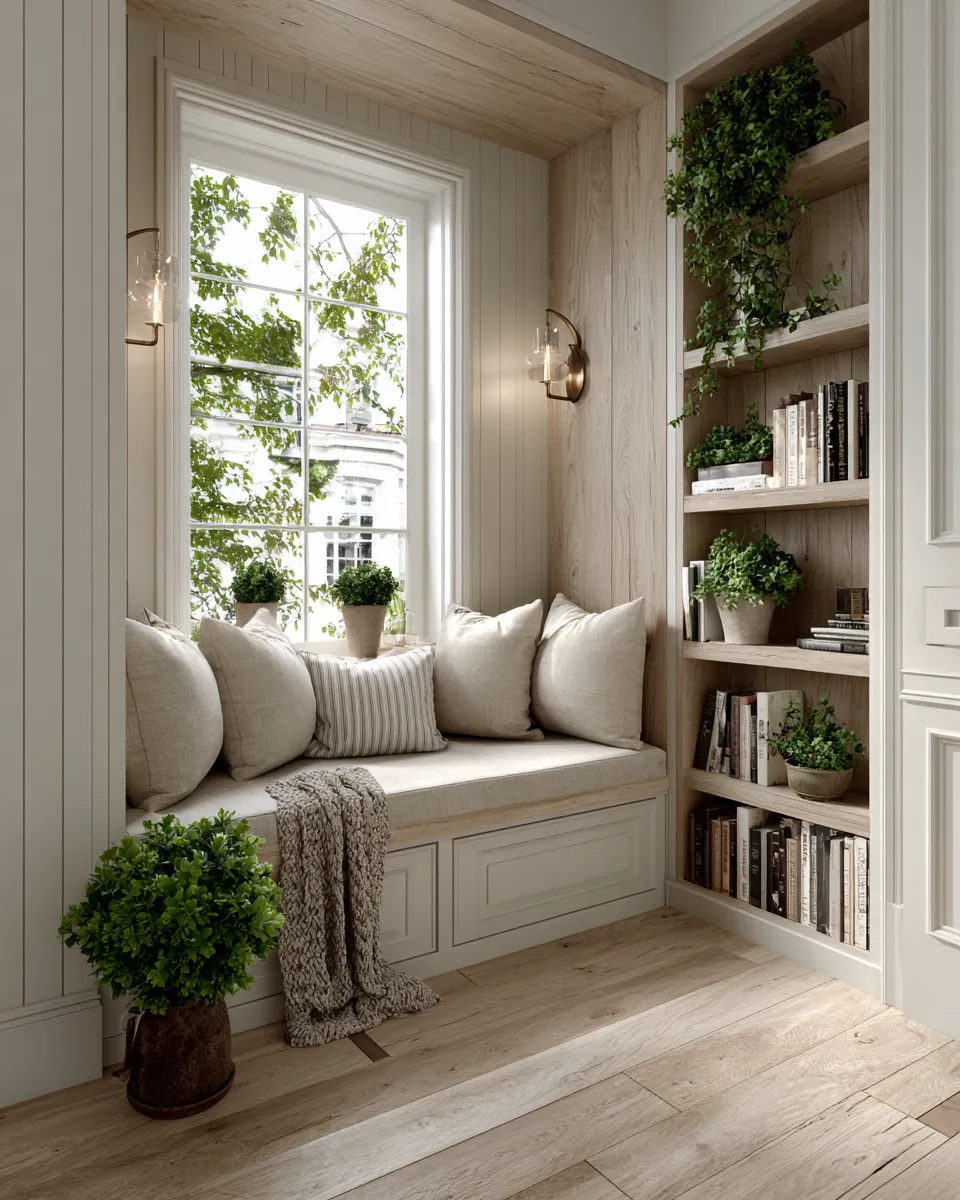 Create a cozy, nature-infused reading nook with a biophilic window seat! 'The Biophilic Builder' loves turning overlooked spaces into serene havens. 🌳