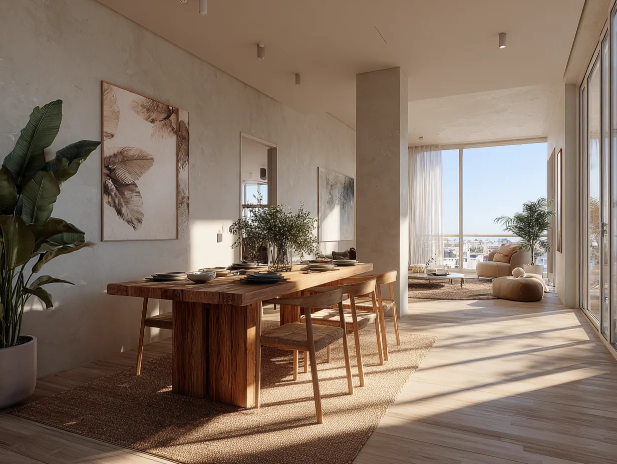 * **Central Greenery:** A striking plant arrangement on the dining table or a small living wall nearby.