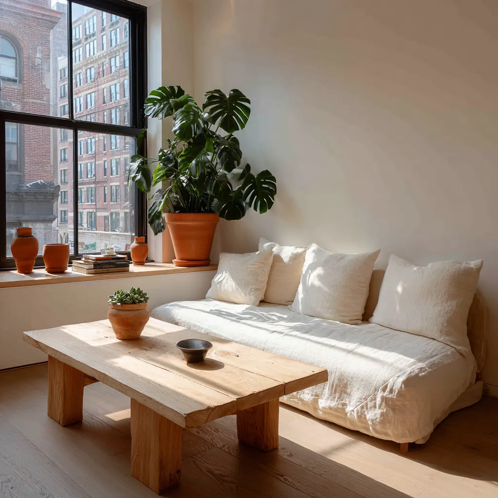 Think of a comfortable sofa upholstered in a natural fabric, a beautiful wooden coffee table, and a large floor-to-ceiling window maximizing natural light.