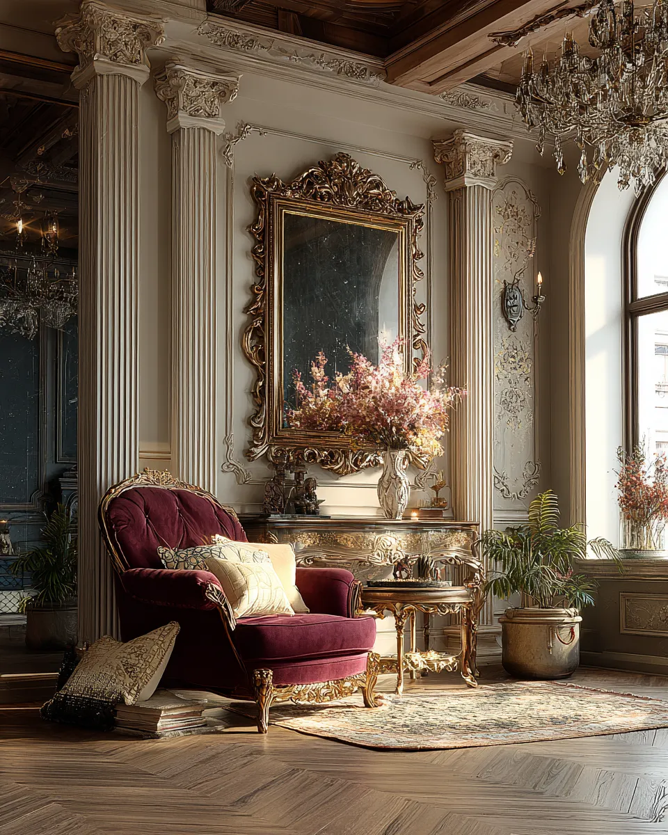 Embrace a palette of soft neutrals, muted golds, and touches of deep navy or burgundy. Incorporate classic furniture shapes: a velvet armchair, an ornate gilded mirror, and a vintage-inspired coffee table. Layer in sumptuous textures like silk and velvet. Ornate moldings and a statement chandelier complete the opulent yet inviting atmosphere. This space is perfect for intimate gatherings or quiet reflection.