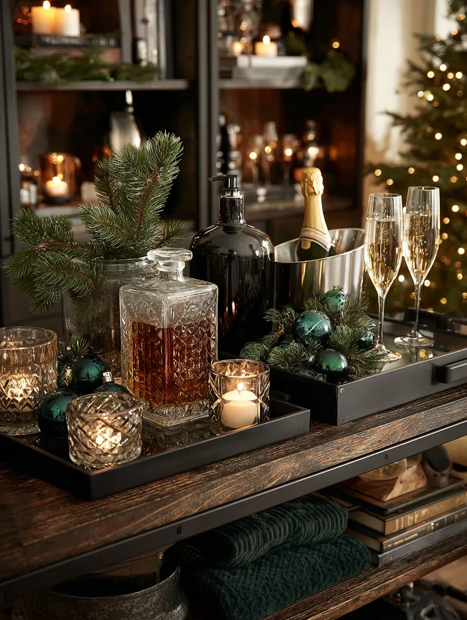 Elevate your holiday entertaining with an industrial-inspired bar cart that screams chic festivity! This season, we're embracing the raw beauty of metal and wood, paired with sparkling Christmas touches. Think sleek, matte black metal shelving, perhaps with reclaimed wood accents. Garnish your bar cart with mercury glass accents, mini pine branches, and classic glass decanters. For a festive pop, hang a few deep jewel-toned baubles from the cart's frame. It’s the perfect station for shaking up seasonal cocktails and impressing your guests. Who's ready to mix and mingle? 🥂 Save this idea for your next holiday party!