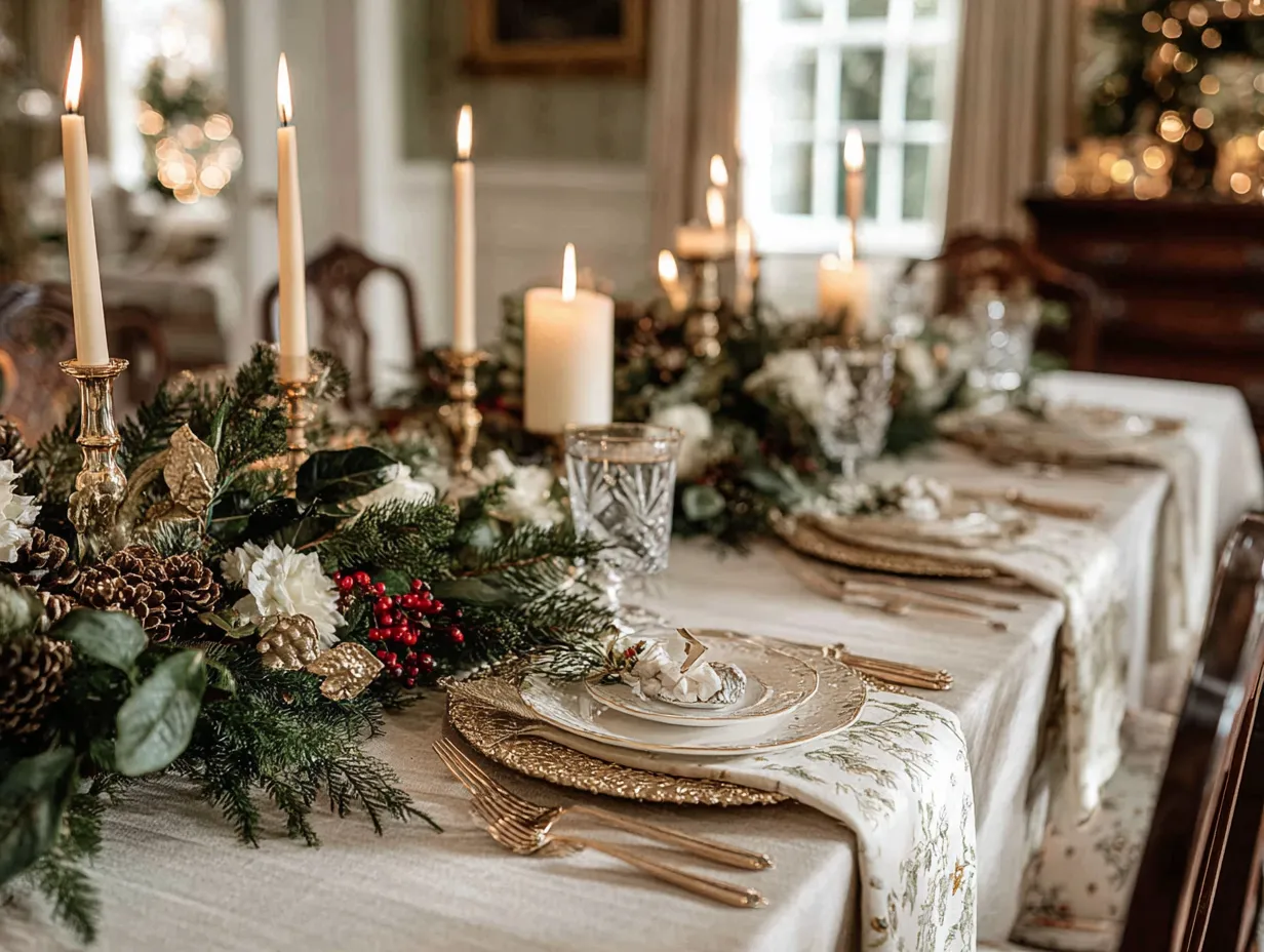 Candles are key for ambiance – opt for unscented, tall tapered candles in elegant holders. Save this for your stunning holiday tablescape! #ChristmasTablescapeIdeas#HolidayDiningIdeas#ElegantChristmasIdeas#ArtfulEntertainingIdeas#UniqueDecorIdeas#FestiveTableSetting#HomeDesignInspo#DinnerPartyDecor#ArtfulHome#HolidayHosting