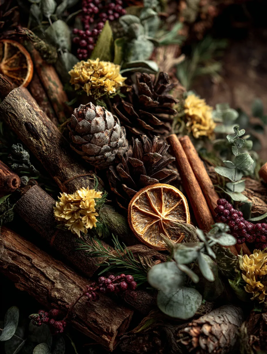 Instead of traditional artificial decor, forage for sustainable materials: fallen branches, pinecones, dried berries, and evergreen clippings. Add touches of natural texture like cinnamon sticks or star anise.