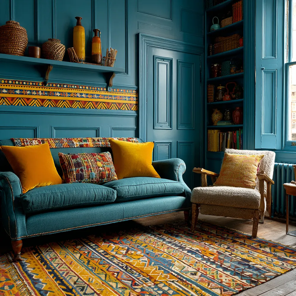 💛 Ochre Yellow & Teal: Eclectic & Vibrant Living Room Blend!