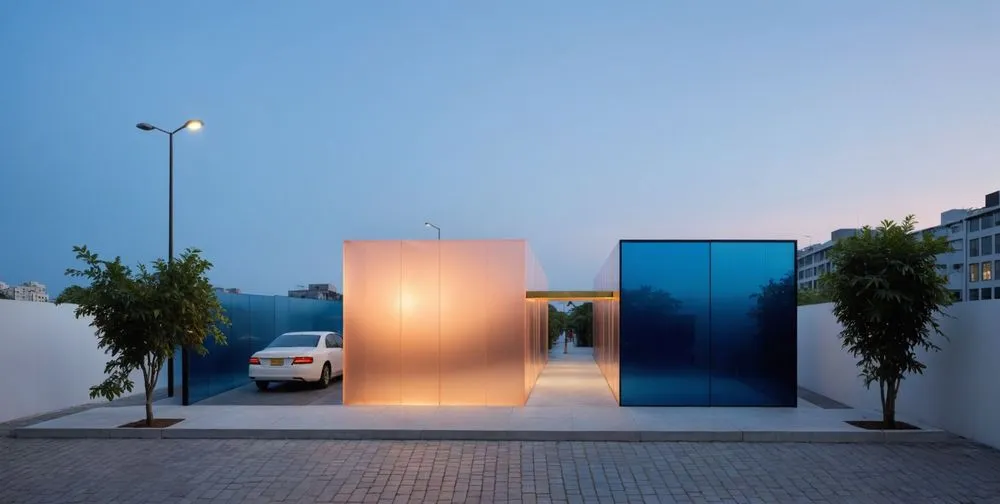 2R1B A 2R1BDA- a car is parked near two rectangular shaped concrete structures