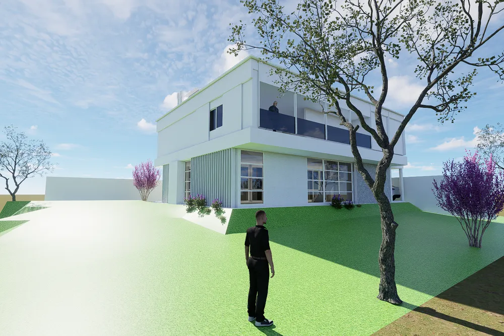A 3d rendering of a modern, minimalist house with a white exterior and a black roof, set against a bright blue sky with fluffy white clouds. the house is centered in the middle of the image, with a large white truck parked in front of it. on the left side of the house, there is a fireplace, and on the right side, there are two large windows with wooden frames, allowing natural light to enter the room. the room is furnished with a bed, a chair, and a table, creating a cozy and inviting atmosphere.