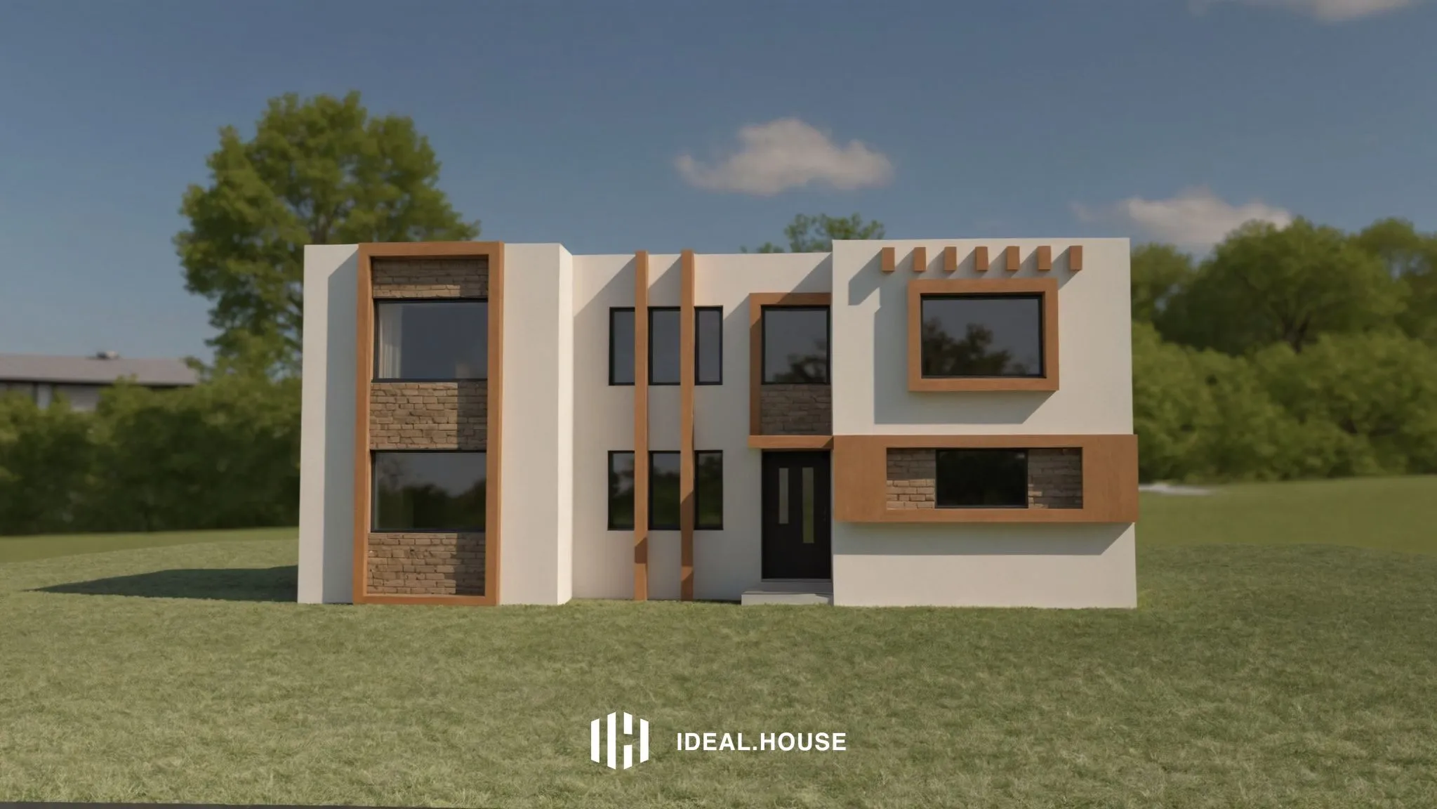 A 3d rendering of a modern two-story house with a minimalist design. the house is situated on a grassy area with a clear blue sky and some green trees in the background. the main focus of the image is the front of the house, which is a two-storey building with a white exterior and wooden accents. The building has large windows on each floor, allowing natural light to filter in and create a bright and airy atmosphere. the windows are framed with wooden frames, adding a touch of elegance to the overall design. a black door is prominently displayed in the center of the building, leading to the entrance. the grass surrounding the house adds a natural touch to the scene, making it a visually appealing and modern addition to any home.