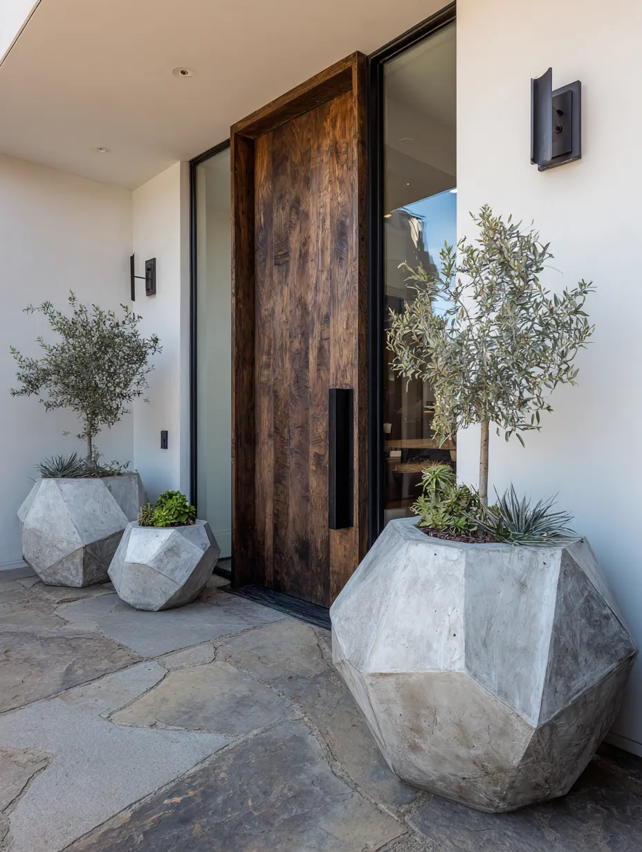 Make your home's exterior as artful and expressive as its interior. Save this for your dramatic entrance inspiration! #SculpturalEntrances#ArtfulDoors#EntranceIdeas#SculpturalEntranceIdeas#ArtfulDoorIdeas#ExteriorDesignIdeas#ExpressiveEntryIdeas#ExteriorDecor#HomeExterior#FrontDoor#Landscaping#AvantGardeEntrance