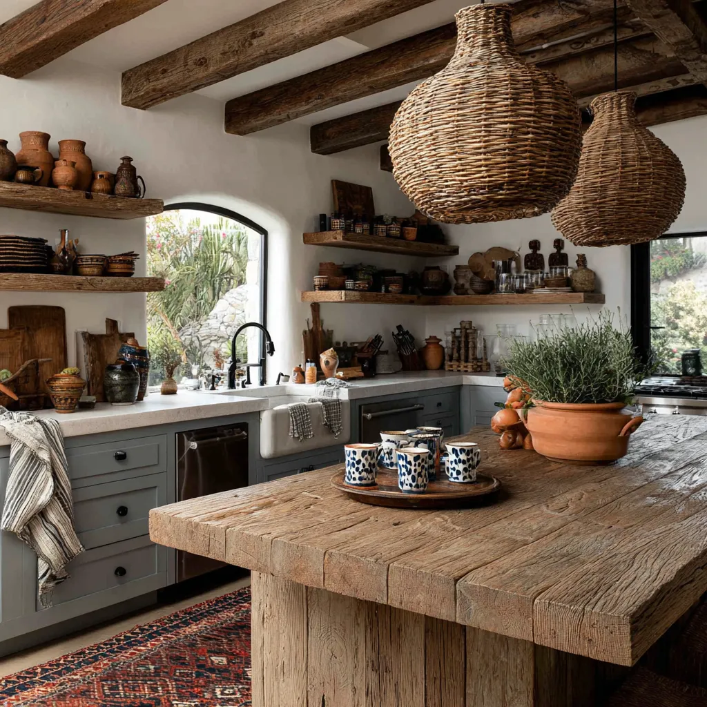 Design your cozy, global kitchen. Save this for inspiration! ✨ #BohoFarmhouseIdeas#GlobalKitchen#CozyDecor#HomeDecor#InteriorDesign#FarmhouseStyle#BohoStyle#KitchenInspo#ArtisanKitchen#DecorIdeas