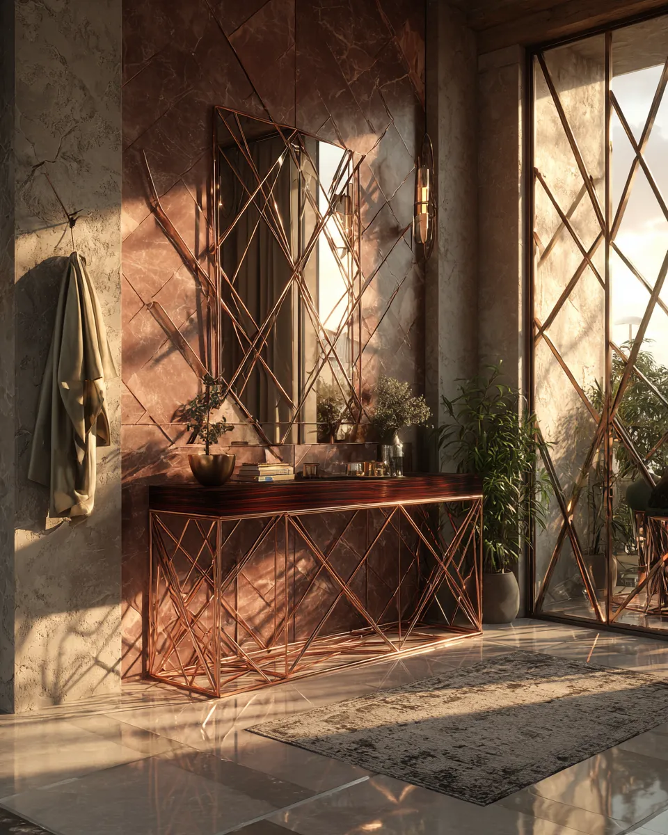 * **Console Table Magic:** A slim console with a copper frame and shelf adds a touch of glam.