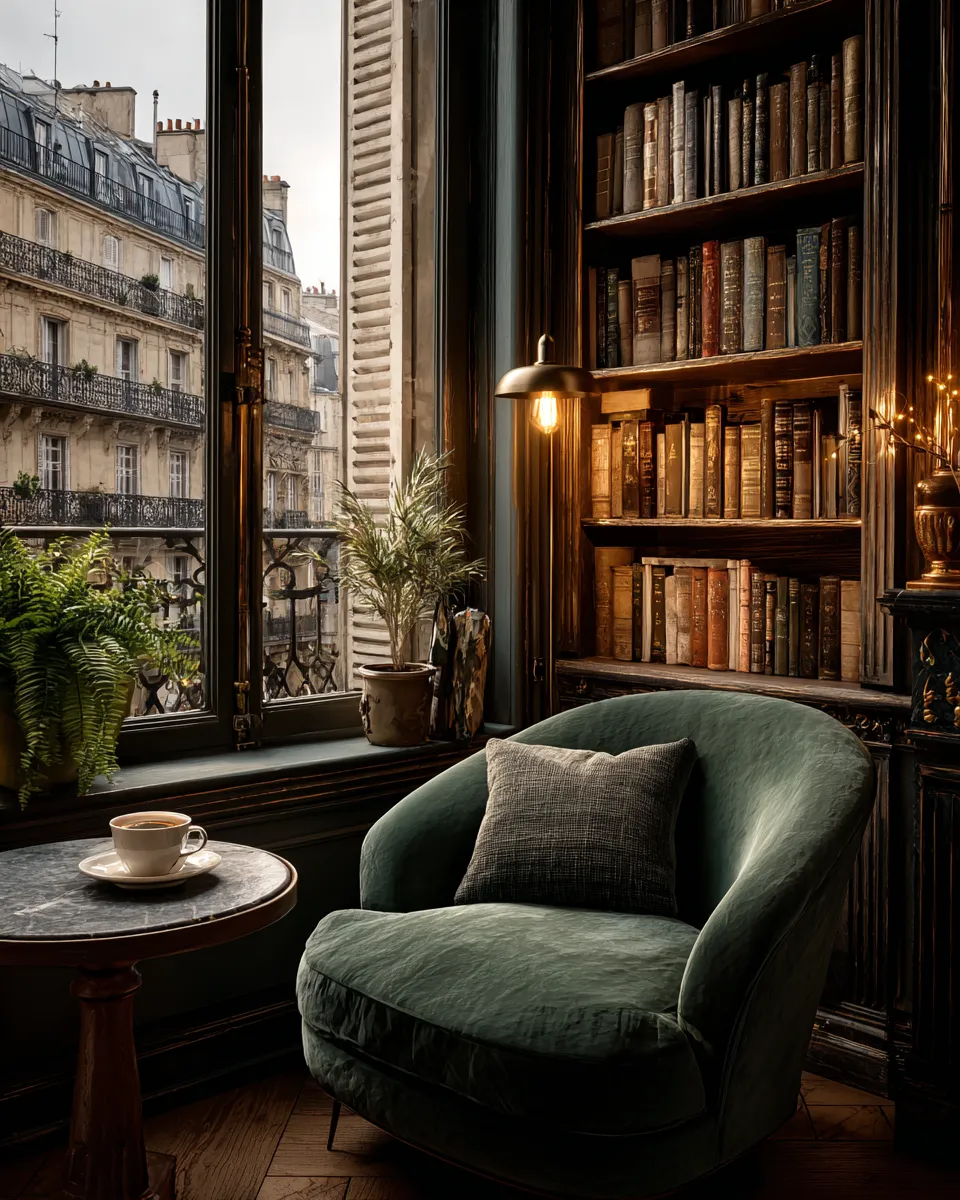 Curl up with a book in your charming nook. Save this for your cozy reading corner ideas! #ParisianReadingNookIdeas#CozyCornerIdeas#ReadingNookInspirationIdeas#ChicRelaxationIdeas#HomeSanctuaryIdeas#ReadingNookDecor#InteriorDesign#HomeStyling#RelaxationSpace#BookLover