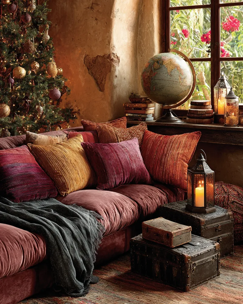 * **Velvet textiles:** Deep red, emerald green, or royal blue velvets for drapes and upholstery.