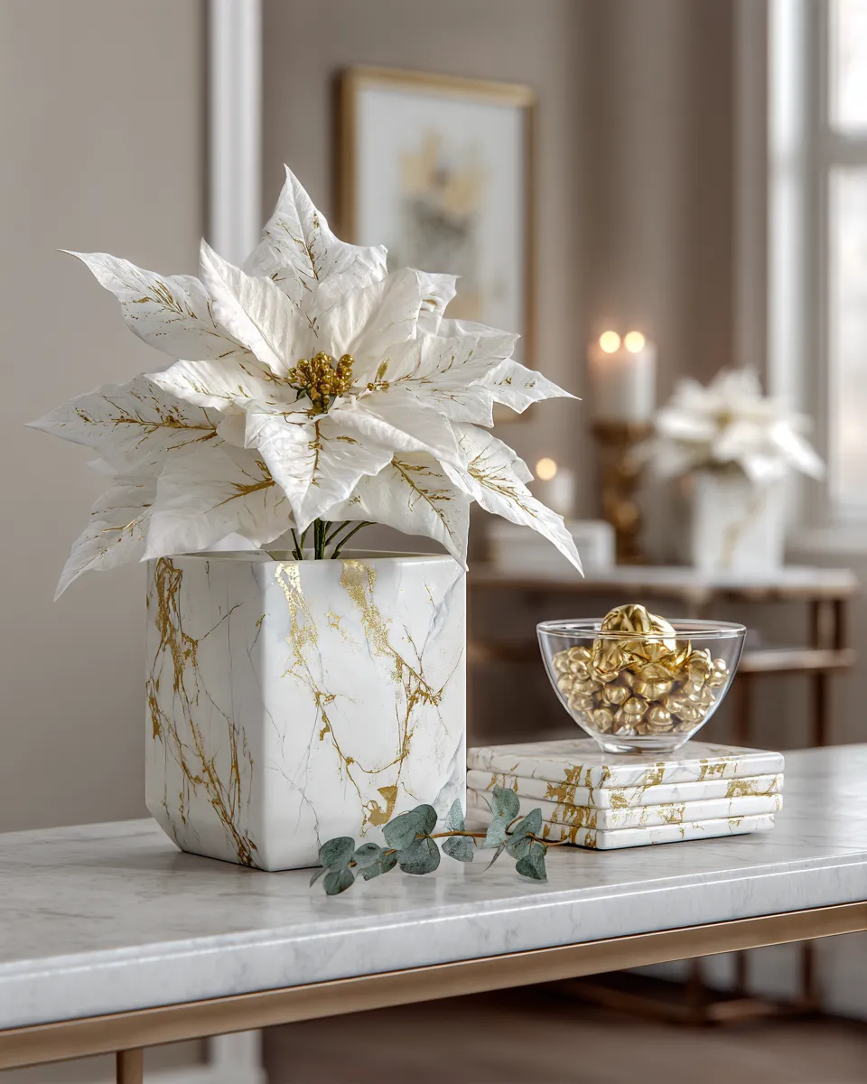 Display delicate white poinsettias in minimalist marble planters on your console table.