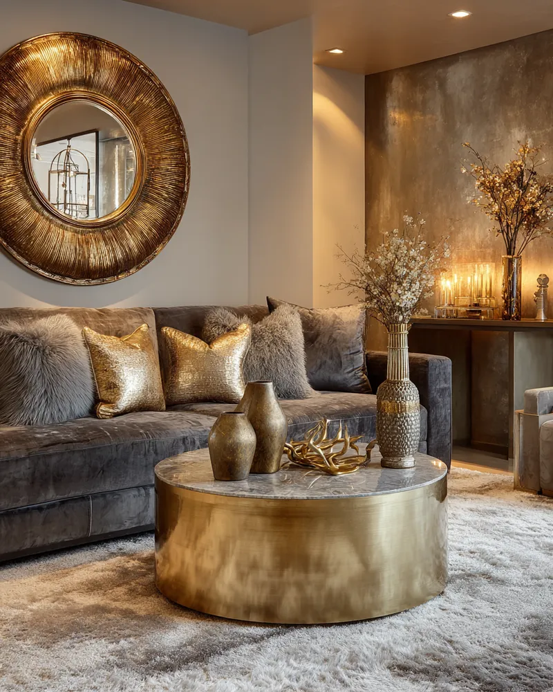 Elevate Your Living Room: Sophisticated Grey & Gold Palette 🖤