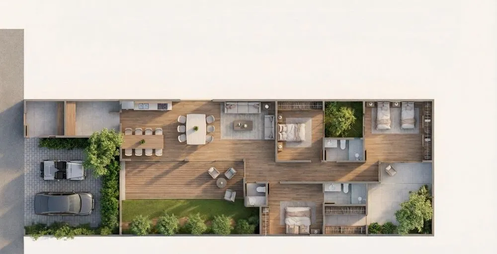 MITOSIS. 3d rendering of outdoor picnic area with steps leading to a small pavilion